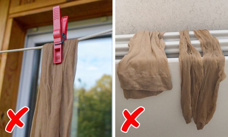 Чтобы колготки служили дольше, сушите их на бельевой веревке, но будьте осторожны с прищепками — эти маленькие «помощницы» могут навредить нежной ткани. Оптимальный вариант — сушить на горизонтальной поверхности вдали от прямых солнечных лучей.