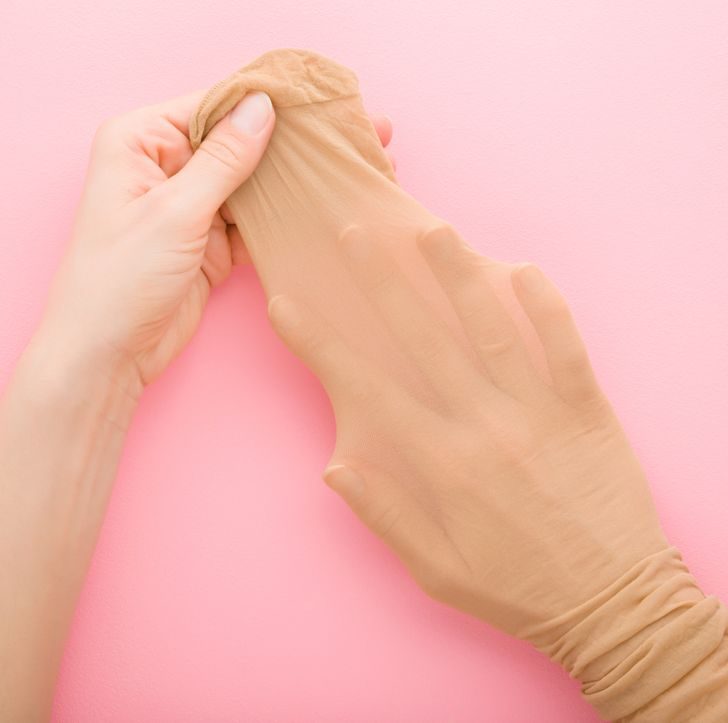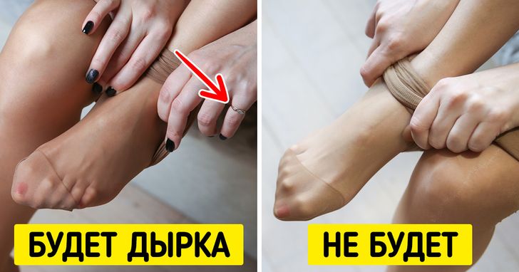 Казалось бы, вполне себе нехитрое действие. Однако иногда мы не обращаем внимания на мелочи, которые вмиг укорачивают срок службы чулочно-носочных изделий. Заусенцы или украшения (например, браслеты или кольца) увеличивают риск появления дырки на тонкой ткани. Некоторые даже советуют надеть тонкие перчатки перед тем, как взяться за колготки.