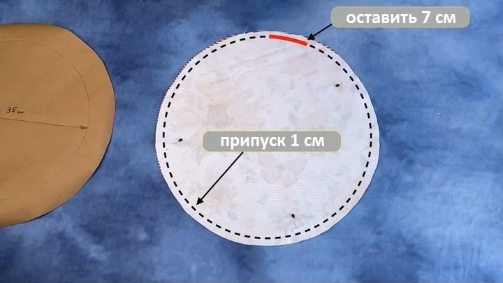 Чтобы сделать выкройку для ткани, обведите основу на листке бумаги, добавьте по кругу 5 см (диаметр 45 см) и вырежьте. Обведите выкройку на двух слоях ткани. Вырежьте. Круги из ткани сложите друг к другу лицом, сколите и прошейте по краю, оставив не зашитыми примерно 7 см. Припуск на шов — 1 см.