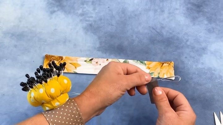 Срежьте уголки и выверните заготовку. Отгладьте швы утюгом, а затем отстрочите периметр, отступив от края 1 см. Отверстие пока не зашивайте. Отмерьте и отрежьте необходимое количество сложенной пополам проволоки. Острые кончики обмотайте скотчем.