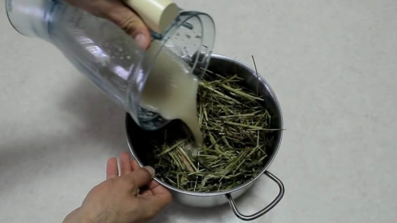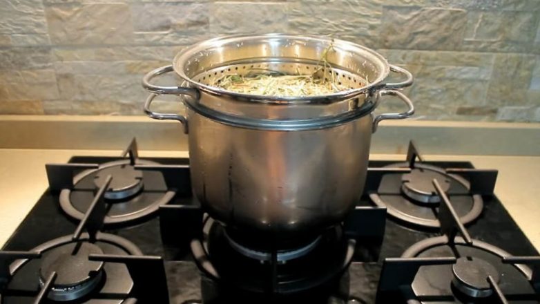 Расти гриб будет на сене или соломе. Возьмите достаточное количество соломы, залейте водой в кастрюле, доведите до кипения, выключите, оставьте в горячей воде на полчаса, пока она не остынет. Это обеззаразит её. Затем достаньте солому, переложите на дуршлаг и дождитесь, пока вся лишняя жидкость не стечёт. Солома должна быть влажной, но без излишков воды при нажатии на неё.