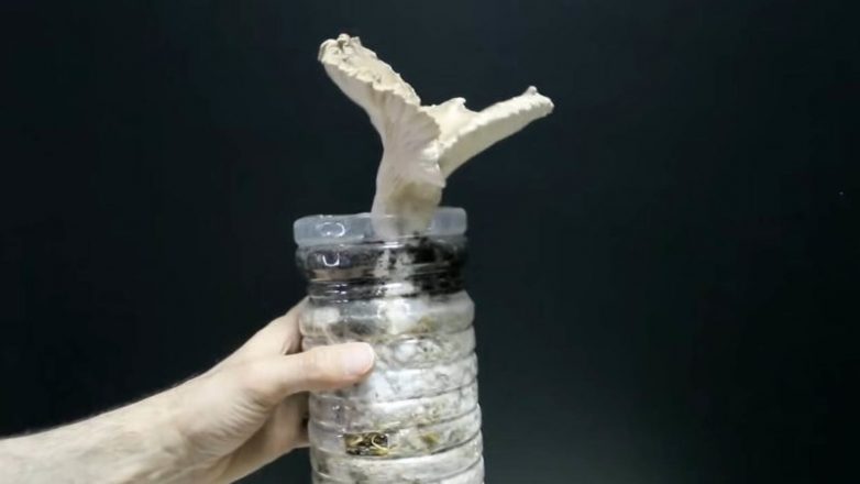 Мицелий напоминает плесень. Как только вы увидите, что он развился равномерно по всей соломе, откройте бутылку, уберите горлышко, сверху насыпьте 2-3 см обычной универсальной земли. По бокам бутылки сделайте 3-4 отверстия примерно 2*1 см канцелярским ножом. Тщательно пролейте солому по земле. Оставьте до созревания грибов.