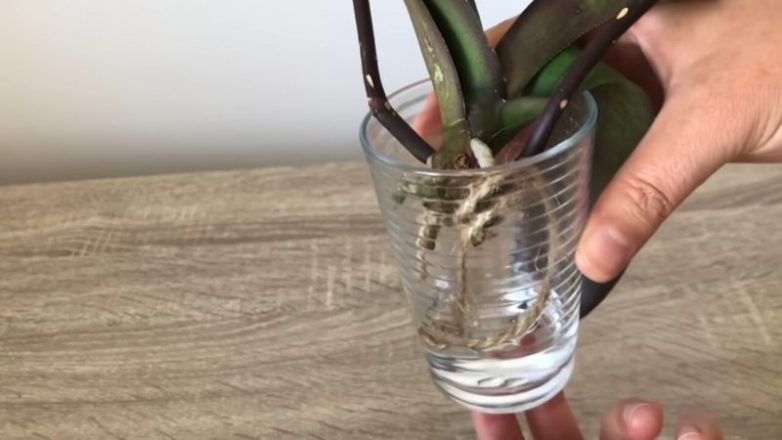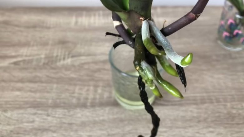 Воспользуйтесь простым трюком, который поможет орхидее нарастить корни. На 1-2 оставшихся живых корня привяжите не туго джут. Если у орхидеи есть только воздушные корни, то привяжите верёвку ко всем воздушным корням очень аккуратно. Конец верёвки опустите на дно стакана, где налито воды буквально на 2 пальца. Орхидея воды не касается. Оставьте в светлом месте без попадания прямых солнечных лучей и поддерживайте уровень воды в 2 пальца.