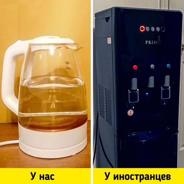 За океаном совсем не в ходу электрические чайники, которые используем мы. Конечно, их можно найти в магазинах, но в домах — гораздо реже. На кухне или даже в жилых комнатах иностранцы ставят кулеры с горячей и холодной водой. Кроме того, для них вполне нормально разогреть воду просто в микроволновке.