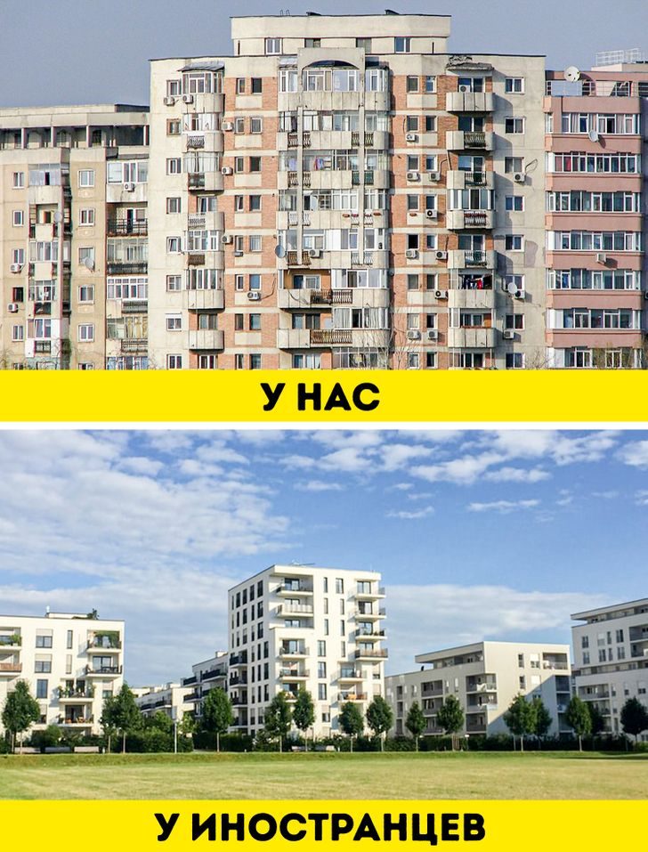 Для России характерны жилые районы, застроенные большим количеством многоэтажных домов. В то время как большинство жителей городов Западной Европы привыкли жить в домах, высота которых не превышает 7 этажей, в редких случаях 10.