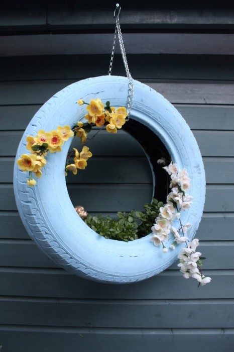 Подвесные клумбы, изготовленные из старых автомобильных шин.