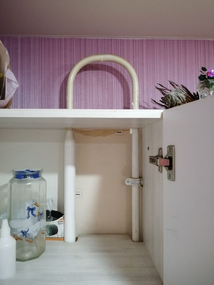 Иногда чрезмерная экономия на материалах сказывается на результатах ремонта. На фото как раз подобный пример: жильцы решили не докупать рулон розовых обоев, а внутри и вокруг шкафчиков наклеили обои разных цветов. Контраст сильно бросается в глаза, стоит только открыть дверцу.
