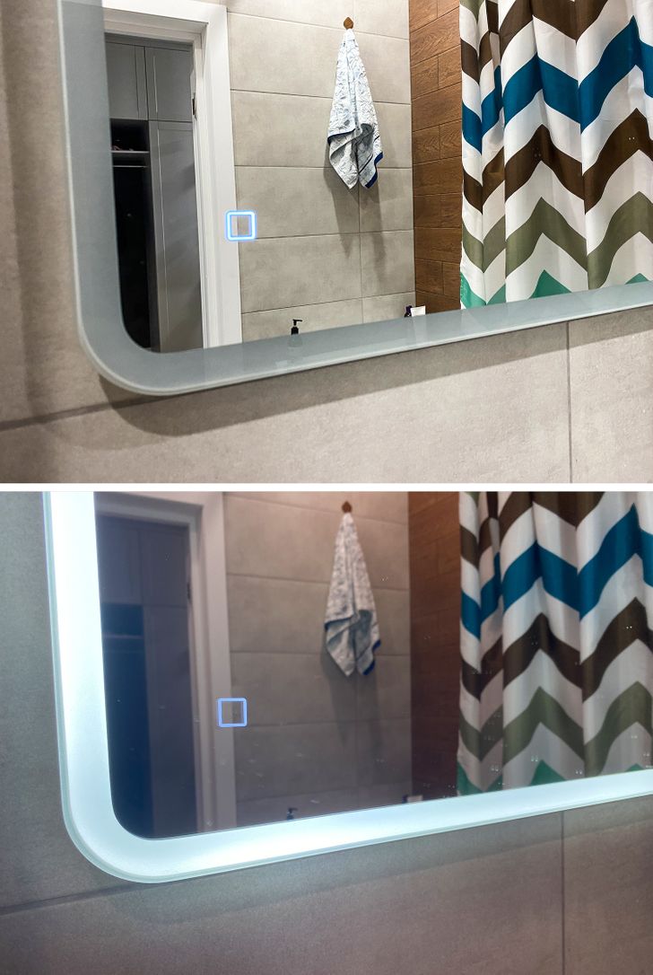 «Хочу зеркало с подсветкой, чтобы было удобно краситься!» — это было, пожалуй, самое главное желание, которое я хотела исполнить именно при планировании ванной. На деле это оказалось и правда классно: все хорошо видно, да и в целом смотрится стильно. Но вот только каждый раз, когда в процессе умывания вы нажимаете на кнопку, на стекло попадают капли. Оттирать такое зеркало можно по несколько раз в день, но следы будут появляться снова и снова.