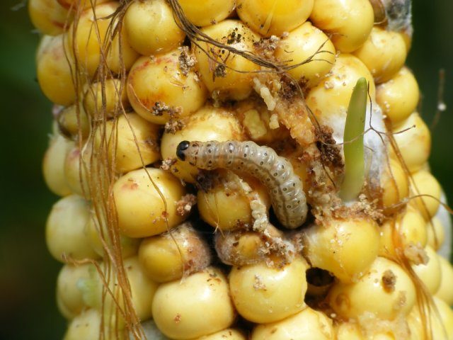 Первые признаки поражения огневкой – выгрызенные пятна на листьях и стеблях, буровая мука (мелкие частички растительной ткани, которые остаются вокруг проеденных насекомыми отверстий) и следы пиршества гусениц на всех частях растения. Зараженная огневкой кукуруза начинает отставать в развитии. Початки вырастают маленькими и хрупкими.