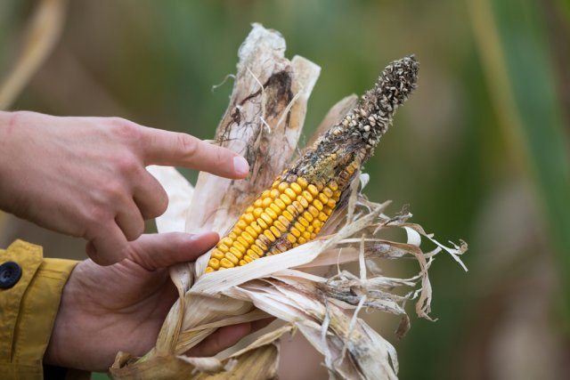 Сухую гниль початков кукурузы вызывает грибок Nigrospora oryzae. Он поражает не только початки, но также основания листьев, стебли и репродуктивные почки. Наиболее активно ведет себя на участках с повышенной влажностью. Первый признак нигроспороза – размочаленная ножка и размягченная нижняя часть стержня, со временем по початку начинает распространяться сероватый налет. При сильном поражении початки остаются недоразвитыми, приобретают сероватый оттенок. Со временем между зернами начинает «расползаться» белая или сероватая грибница, которая в какой-то момент начинает чернеть.