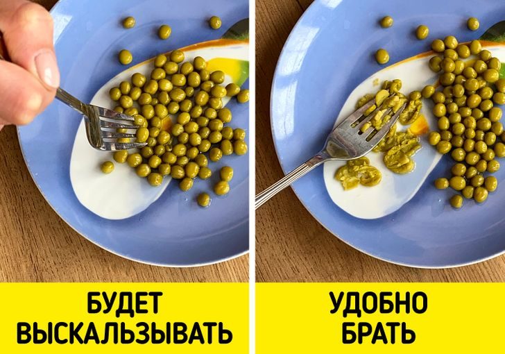 Горошины оказываются довольно юркими, когда пытаешься поймать их вилкой на тарелке. Поэтому лучше их сначала размять. Нужно не нанизывать горошины на вилку, а раздавить их ею, чтобы было легче собрать с тарелки.