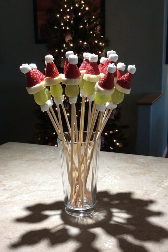 Новогоднее канапе никого не оставит равнодушным. На низ шпажки нанизывается маршмеллоу, далее идет виноград, потом ‒ немного сыра и клубники. Завершающим элементом необычного декора является шляпка из маршмеллоу.