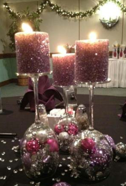 Смотрите, какая классная идея! Для создания такой красоты вам понадобится свеча и обычный бокал для шампанского. Бокал переворачивают, а в него кладут игрушки или мишуру. Сверху бокала устанавливают блестящую свечку. В итоге вы получите яркий подсвечник к Новому году.