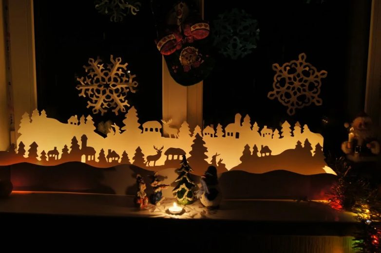 Ее можно сделать своими руками. Необходимо найти подходящий вариант в Интернете и распечатать на принтере трафарет. По нему можно обвести рисунок и вырезать его из картона. Дополнить композицию можно снежинками.