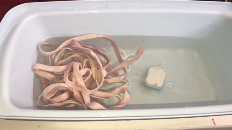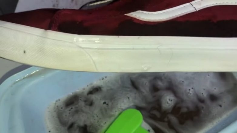 Шнурки будут идеально чистыми уже через 5-10 минут. Грязной водой, оставшейся от шнурков, почистите с помощью щётки подошву, чтобы убрать основную грязь.