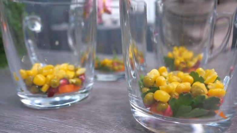 Тем временем залить желатин водой и оставить для набухания. В чашки на дно положить мелко порезанную отварную морковь, горошек и кукуруза, зёрна граната, зелень по вкусу.