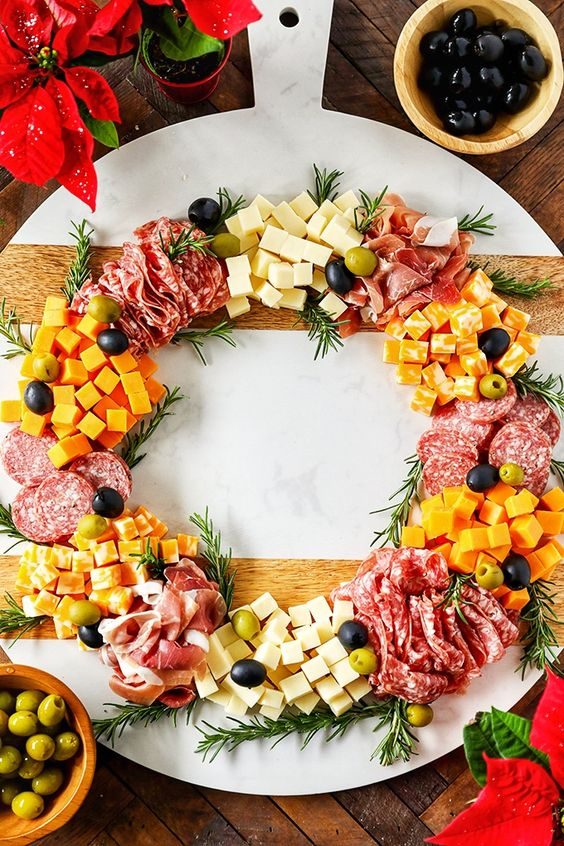 Таким образом можно разложить нарезки сыров и колбас, овощи, фрукты, салаты и даже выпечку. Добавьте несколько веточек розмарина, которые напоминают иголки елочки, чтобы добиться потрясающего результата.