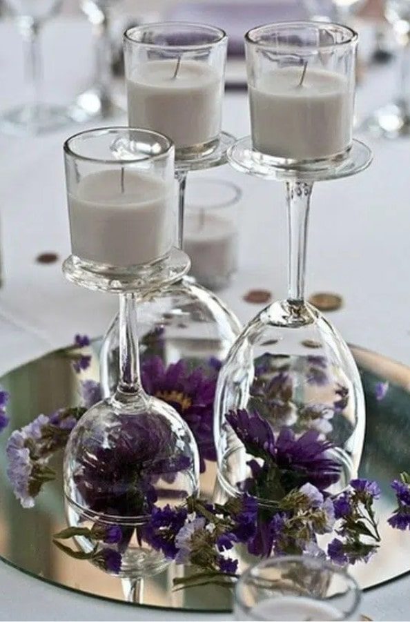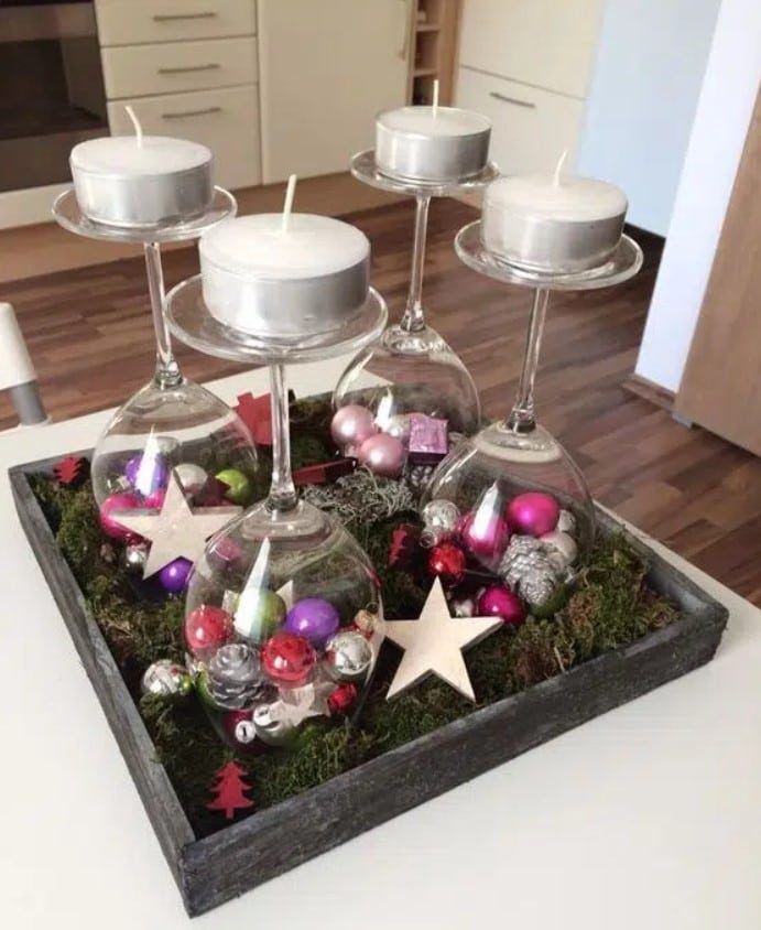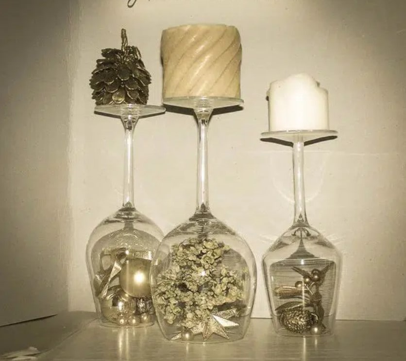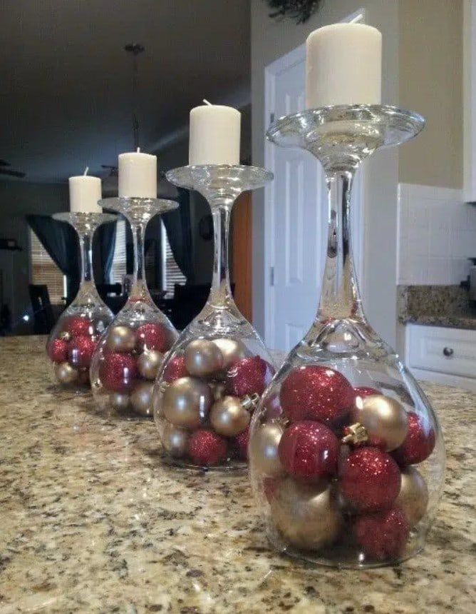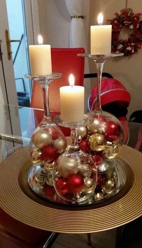Для того чтобы сделать декор в бокалах понадобится буквально несколько минут и пара новогодних игрушек, свечей, шишек. Просто поместите в бокалы несколько декоративных элементов, и результат будет потрясающим! Оригинально и очень празднично смотрятся перевернутые бокалы, на ножку которых ставится свеча. А если у вас есть желание творить, то вы можете покрыть бокалы краской и создать в них имитацию снега.