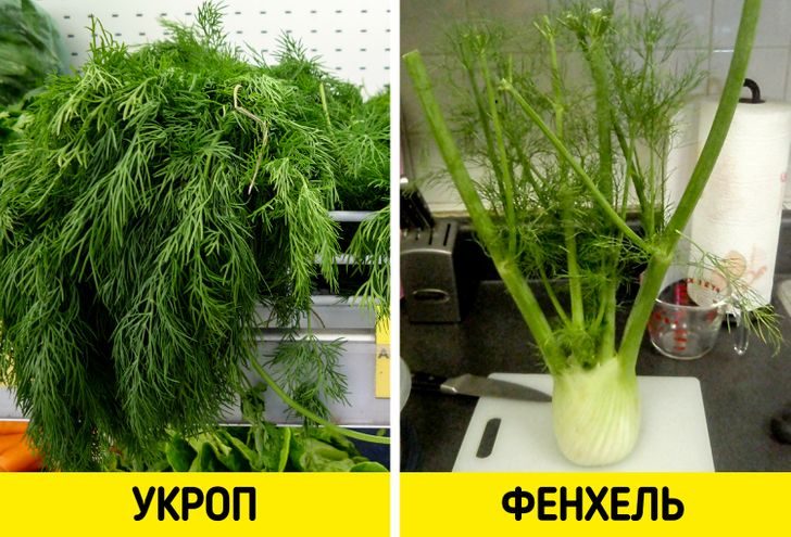 Укроп и фенхель похожи по внешнему виду и структуре листьев, но имеют совершенно разные вкус и аромат. Запах фенхеля скорее похож на солодку, а укроп имеет собственный, ни с чем не сравнимый аромат. К тому же укроп выращивают именно как зелень. А фенхель ценится не только за вершки, но и за корешки.