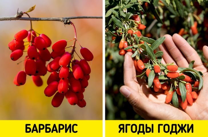 Эти ягоды похожи, пожалуй, только внешне. На деле годжи относятся к семейству пасленовых, поэтому они ближе к картошке, чем к барбарису. Да и на вкус они совершенно разные. Барбарис дает больше кислинки, годжи слаще и имеют волокнистую структуру, похожую на сушеное яблоко.