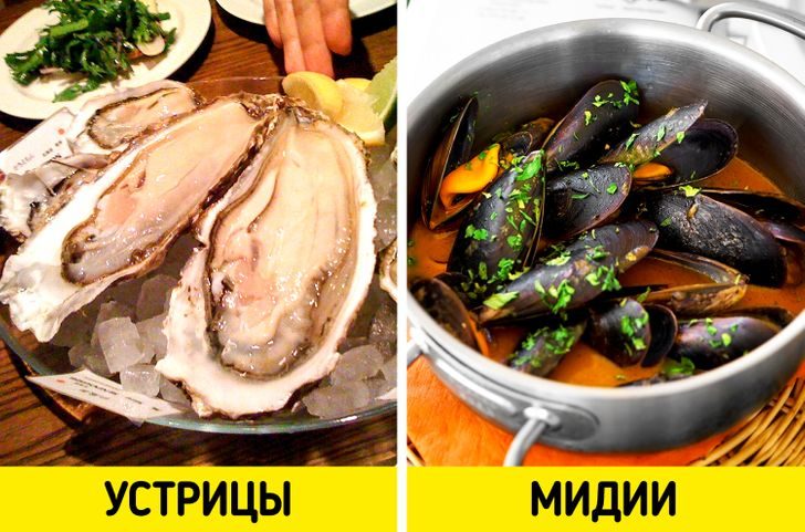 И устрицы, и мидии — это моллюски, которые высоко ценятся любителями морепродуктов. Устрицы обычно крупнее и имеют более твердые раковины, а внутри они более мясистые. У мидий створки тоньше, темнее и более продолговатые, а еще есть ножка, с помощью которой они могут передвигаться под водой (хоть и предпочитают этого не делать).