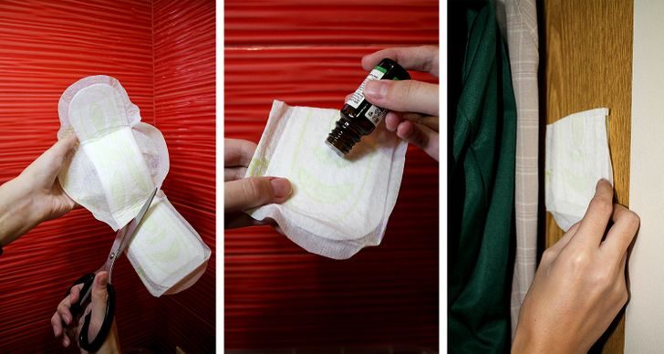 Для создания приятного аромата в шкафу отрежьте кусок прокладки, нанесите несколько капель эфирного масла или любимых духов, а затем приклейте на стенку шкафа
