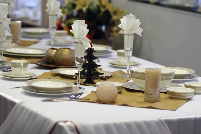 Можно также сделать посуду основным аксессуаром. Если украшений будет минимум, в пору будет пустить в ход броский набор. Лишь бы сочетался по цвету со скатертью. То же самое и со столовыми приборами. Используя серебристый цвет в оформлении, выбирай посеребренные приборы. Перебарщивать с разными металлами не стоит.