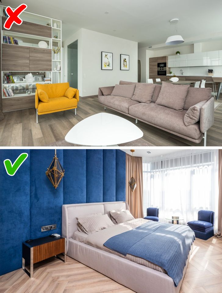 Один предмет, ярко выделяющийся цветом на фоне других, своим видом раздражает не меньше светофора, застрявшего на красном или желтом свете. К тому же дизайнеры считают, что тенденция делать один яркий акцент в комнате уже устаревает. То же касается и популярного тренда красить одну стену в красочный оттенок. Если вы действительно хотите добавить яркости помещению, лучше выкрасите все стены в более интересный цвет.