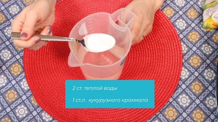 Возьмите два стакана тёплой воды и добавьте 1 столовую ложку кукурузного крахмала. Размешайте крахмал до однородности.
