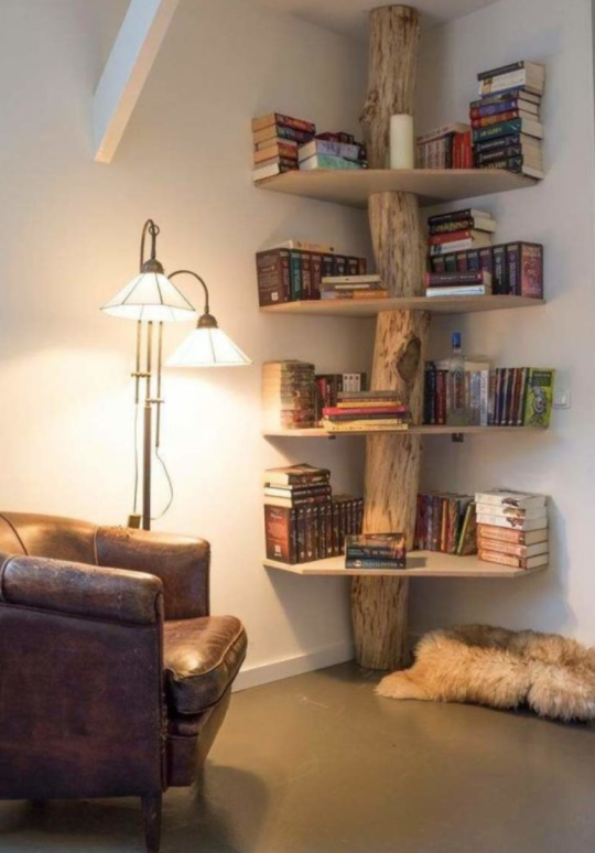 И самый частый вариант – это книжная полка из деревянного материала. Только делайте ее не в привычном стиле, а с креативным стволом.