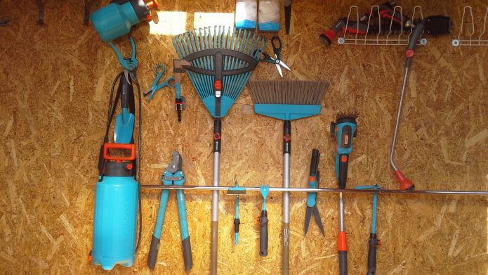 Годами накопленные лопаты, грабли и тяпки удобнее всего хранить вдоль стены – так не придётся искать нужный инструмент, стоящий где-то в углу вместе с остальным инвентарём. Вешать их можно на металлические или деревянные держатели для полок, либо использовать шурупы, прикрученные так, чтобы черенки находились между ними.