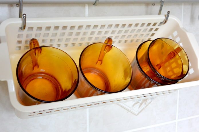 Практичный вариант для тех, кто вешает столовые приборы на рейлинги. Пластиковая корзинка с отверстиями станет дополнительным местом хранения мелочей. Также её можно применять в качестве сушилки для посуды – влага не испортит материал.