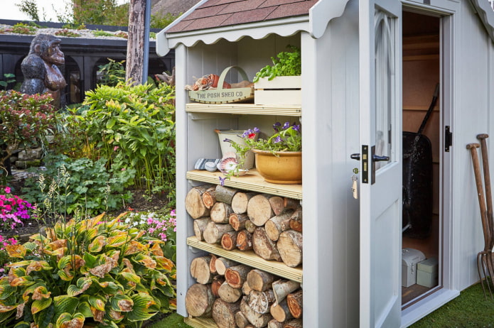 Материал для растопки тоже нужно хранить красиво. Если соорудить для дров отдельную веранду, они будут укрыты от непогоды и хорошо проветриваться. Но если для костра или печи не требуется много дров, подойдёт эстетичная мини-поленница.