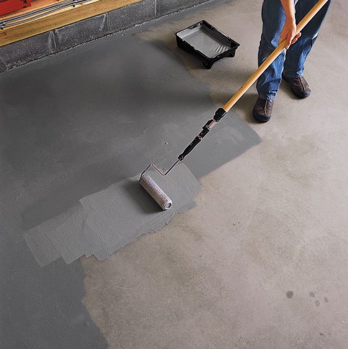 В качестве альтернативы пропитки нередко используется обычное окрашивание. При этом способе на бетонную поверхность сначала наносится грунтовка (обычно в 2 слоя). Затем ее покрывают слоем краски, которая образует барьер между окружающей средой и бетоном, не давая последнему пылить.Важно! Часто окрашивание преподносится в качестве бюджетной альтернативы другим способам обеспыливания бетона. Однако следует понимать, что на практике экономия возможна только при использовании низкокачественных или неподходящих материалов. Специализированные краски и грунтовки для обеспыливания бетона стоят достаточно дорого.