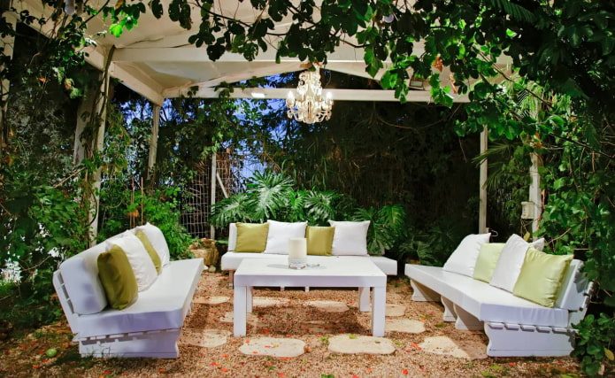 Для террас, пергол и арок выбирают подвесные светильники. Вдоль дорожек и рядом со ступенями устанавливают декоративные фонарные «столбики» или грунтовые лампы, встраиваемые в дорожное покрытие.