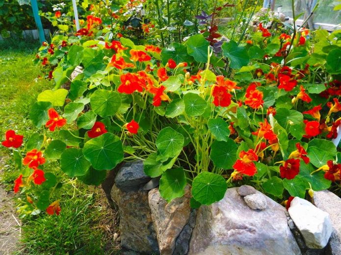 Настурция декоративна необычными фигурными соцветиями и круглыми листьями с прорисованными жилками. Невысокий цветок отлично смотрится в групповых посадках и в качестве бордюрной каймы вдоль клумб и дорожек.Цветы настурции — это крупные ассиметричные корзинки простого или махрового типа. Наиболее распространены желтые и оранжевые. Распустившиеся бутоны часто используются в кулинарии для украшения готовых блюд, а свежие молодые листья добавляют в салаты.