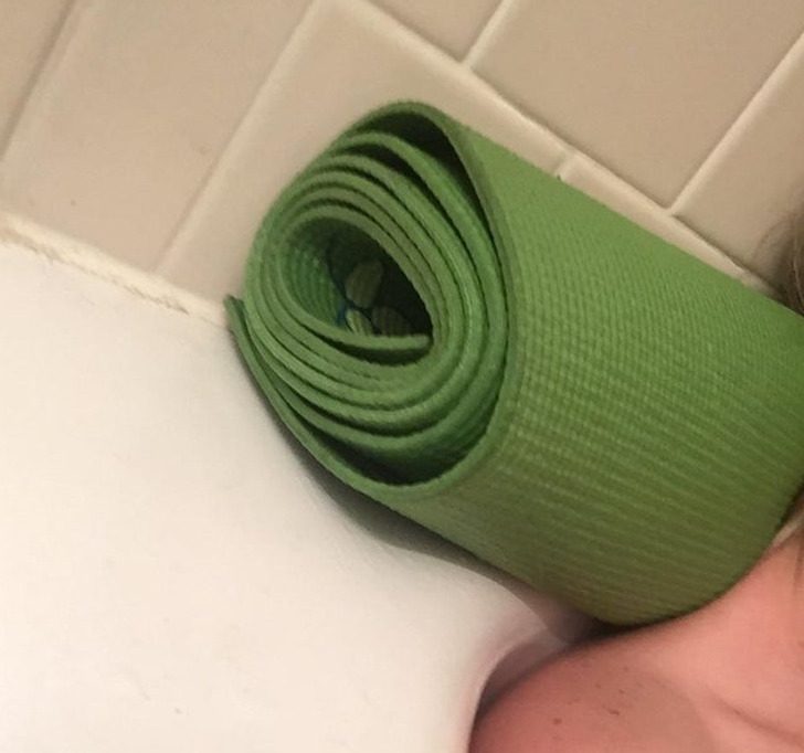 2. Коврик для йоги можно использовать как подголовник во время принятия ванны. Он водостойкий и удобный!