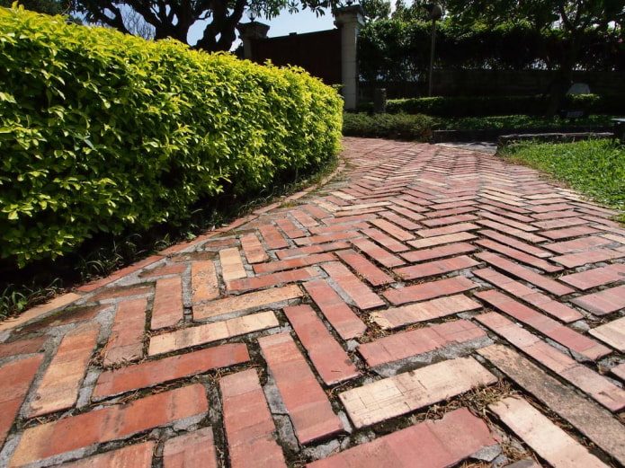 При мощении дорожек из цельного кирпича можно поэкспериментировать со схемой укладки. Всегда оригинально выглядят тропинки, выложенные елочкой, по диагонали, блоками по 2-3 кирпича или линейно с перевязкой.