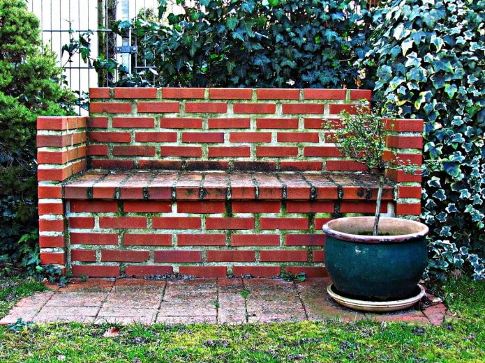 В сочетании с деревянными рейками кирпич активно используют для обустройства места отдыха. Чтобы выложить надежные ножки для садовой лавки или столика, понадобится всего пара часов, зато конструкция простоит не один год.Если кирпича много, можно выложить круглую лавку вокруг клумбы или в приствольном круге дерева. Для сиденья подойдет вагонка, остатки террасной доски или планкена.
