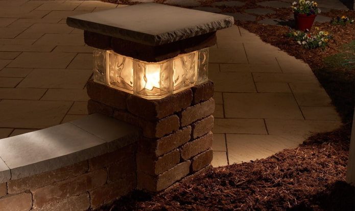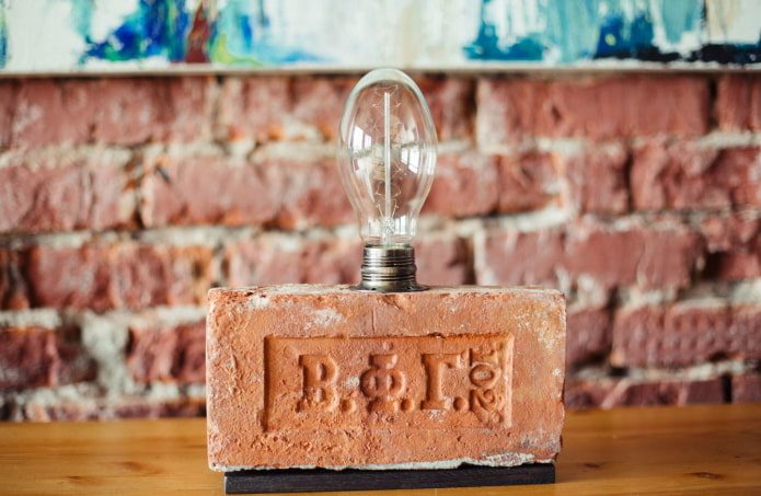 Просверлив в центре кирпича небольшое отверстие для патрона и шнура, можно создать оригинальный светильник для дачного интерьера. Оригинальный «плафон» никогда не останется незамеченным, хотя и обойдется практически бесплатно. Для уличного освещения чаще сооружают невысокие столбики, внутри которых прячется проводка.