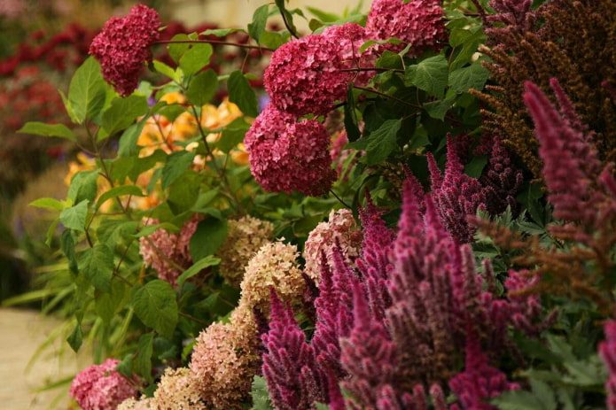 Крупные ажурные листья, собранные в раскидистые метелки соцветия и десятки различных оттенков астильбы сделали её частым гостем на садовых участках. Она отличается продолжительным цветением, подходит для создания пышных клумб, в том числе и по соседству с гортензией.Кусты имеют примерно одинаковую высоту, не перекрывают друг другу солнечный свет. Единственный «спор» может возникнуть из-за полива. Астильба предпочитает более увлажненную почву. Чтобы гортензия из-за переизбытка влаги не начала хилеть, поливать цветник придется точечно.