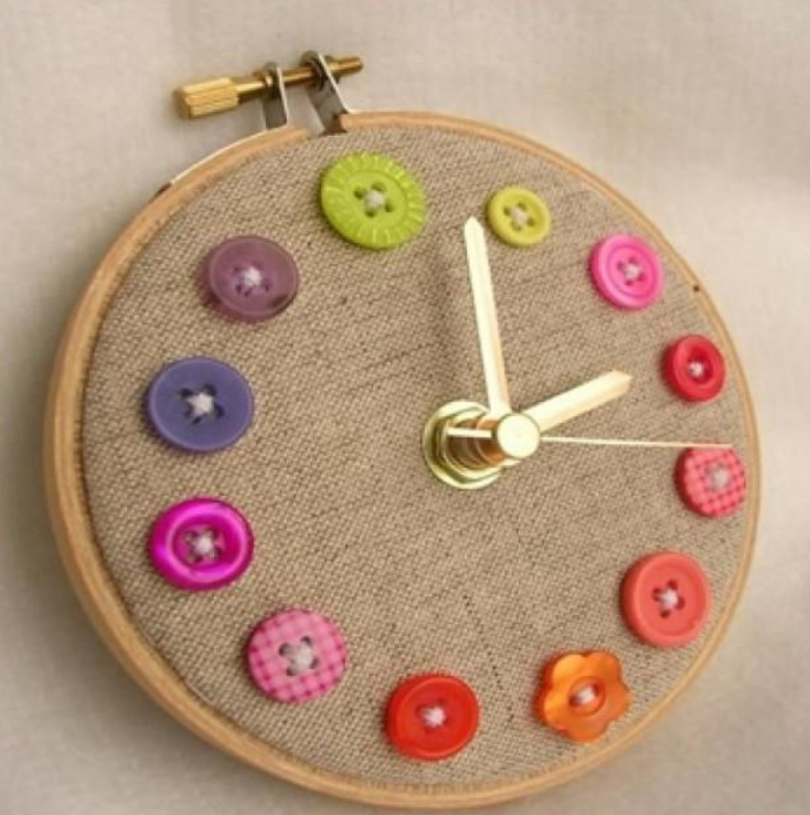 Для настоящих рукодельниц отлично подойдет идея часов, сделанных в виде креативной вышивки. Для этого вам понадобятся пяльцы, нитки и можно каждый час выделить яркой пуговкой.