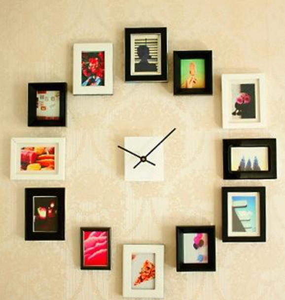 Чтобы часы также выполняли роль оригинальной детали в квартире, стоит напротив каждого часа разместить красивую фоторамку. Это могут быть ваши памятные снимки или просто картины с красивым пейзажем.