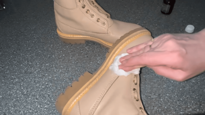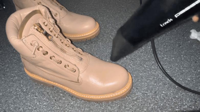 Обработанную поверхность нагреваем при помощи фена, а затем предельно быстро начинаем разминать сапоги или ботинки.