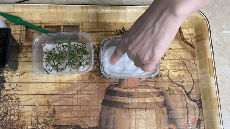 В хаотичном порядке раскладываем по поверхности семена, а затем накрываем крышкой и убираем в темное место. Плотность посадки здесь не имеет значения. Через 1-2 дня помещаем под лампу. При достаточном количестве света проклюнувшаяся рассада не будет вытягиваться.