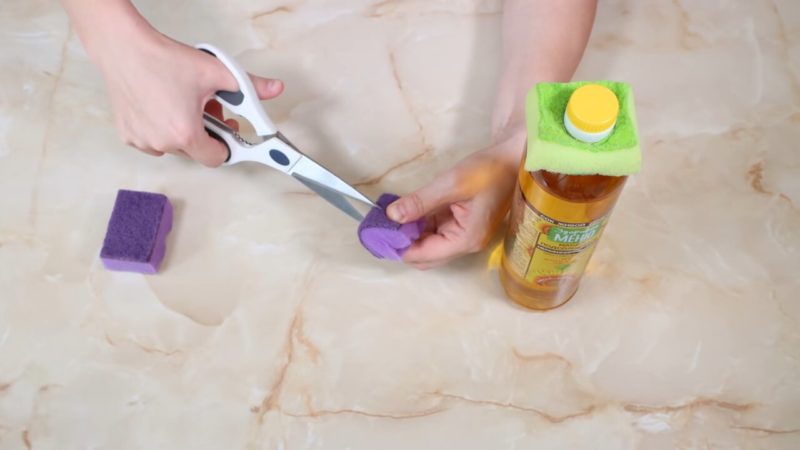 После наливания масла, на бутылку, как ни старайся, всегда стекает пара капель масла. А из-за этого масляными становится и сама бутылка, и руки, и стол. Чтобы это предотвратить, просто наденьте «манжету» на бутылку. Для этого отрежьте половинку губки и в центре сделайте небольшое отверстие ножницами. Наденьте «манжету» на бутылку. Лучше, чтобы отверстие было небольшим, и губка крепко сидела на бутылке. Теперь при наливании масла, ни одна капелька не испачкает кухню и ваши руки! Такая «манжета» многоразовая: после того как бутылка закончилась, её можно снять, постирать вручную и снова надеть на другую бутылку.
