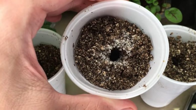 После этого их следует высадить в покупную, хорошую, рыхлую почву с вермикулитом. Черенки в таком грунте отлично укоренятся. Сделав углубление в земле, подсыпьте туда совсем немного Корневина. Если у вас нет такого средства, то можно взять таблетки янтарной кислоты, растолочь и также слегка присыпать в углубление. Высаживаем и проливаем водой.
