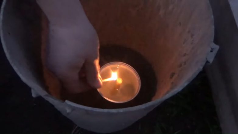 Когда алебастр застынет, налейте подсолнечное масло до верха. Не используйте самое дешёвое масло, так как из-за него фитиль может покрыться нагаром. Остаётся дело за малым — зажечь свечу, установить её в старое ведро.