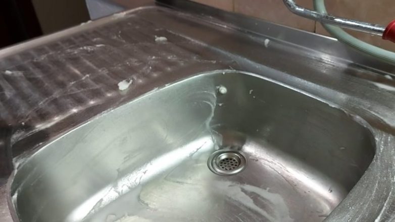 Сначала раковину следует почистить от известковых следов, которые образуются из-за жёсткой воды. Для этого можно использовать соду с уксусом.