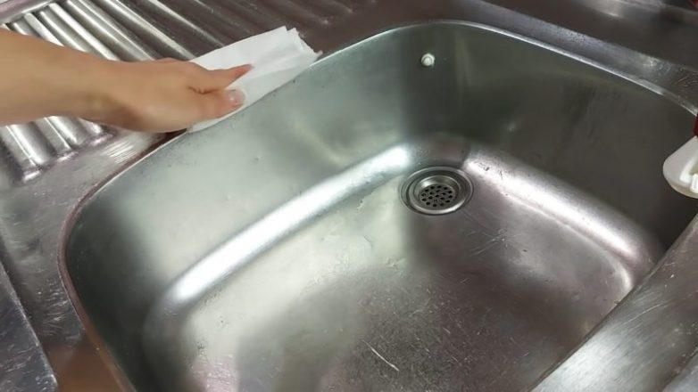 Просто нанесите соду, погашенную уксусом, на всю раковину, особенно на смеситель, потрите и оставьте на полчаса. Затем тщательно смойте и вытрите раковину насухо.